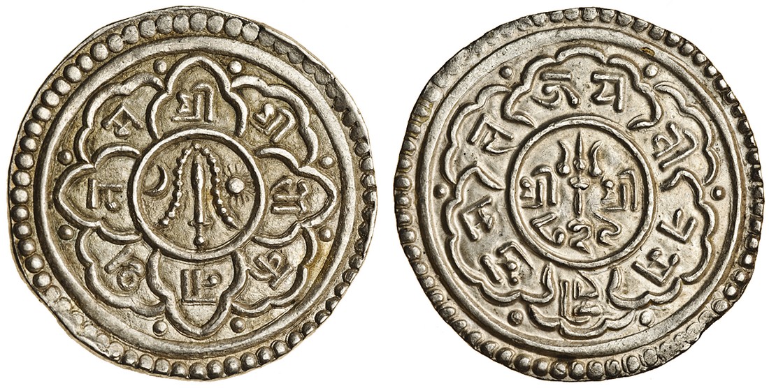 Nepal, Patan, Jaya Vira Mahindra Malla (1709-15), Mohar, NS 829 (1709), trident with date below within central circle, legend around naming Vira Mahindra, rev. garlanded sword with legend around within lotus petal frame (RGV.443; KM.370), good extremely fine