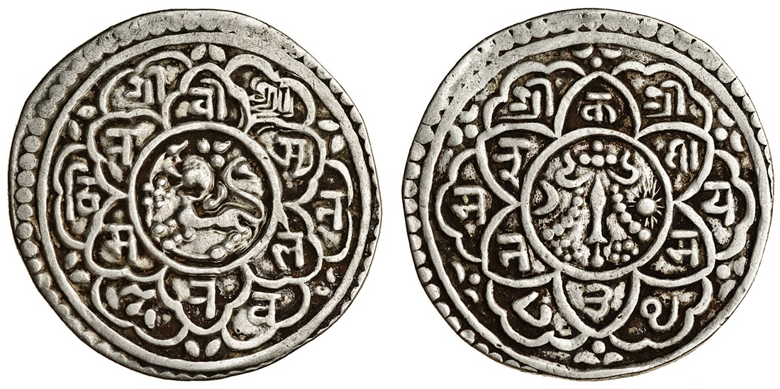Nepal, Patan, Riddhi Narasimha Malla (1715-17), Mohar, NS 835 (1715), lion within central circle, legend around within petals naming Riddhi Narasimha, rev. similar design with garlanded sword in centre, date in petals below (RGV.447; KM.375), about very fine