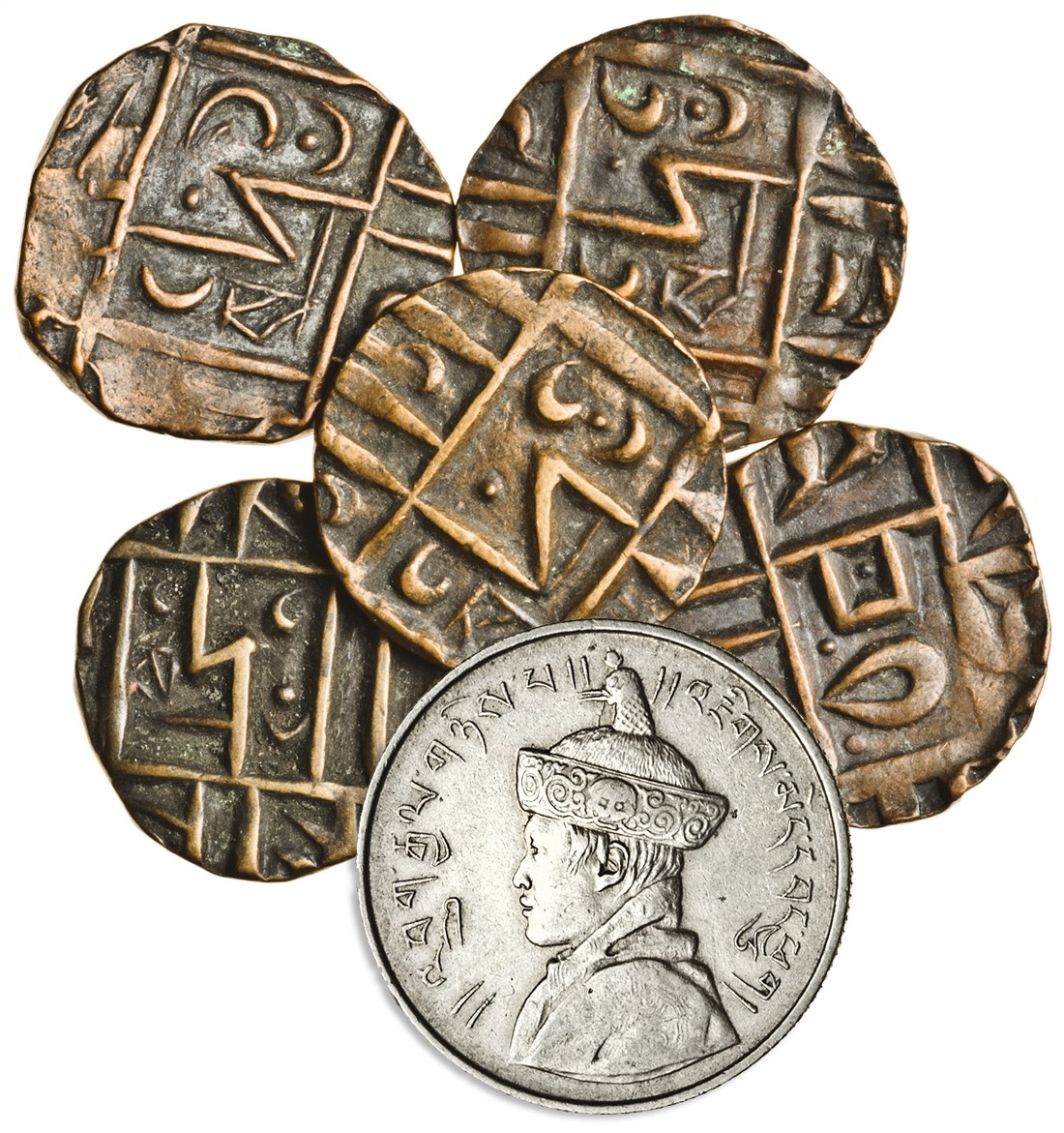 Bhutan, Ni. ½-Rupee, undated (1950), actually struck 1967-8, AE ½-Rupee (Deb) (5), undated (1835-1910), (KM.7.1, 7.2, 28), the copper coins very fine, Nickel ½-Rupee, extremely fine (6)