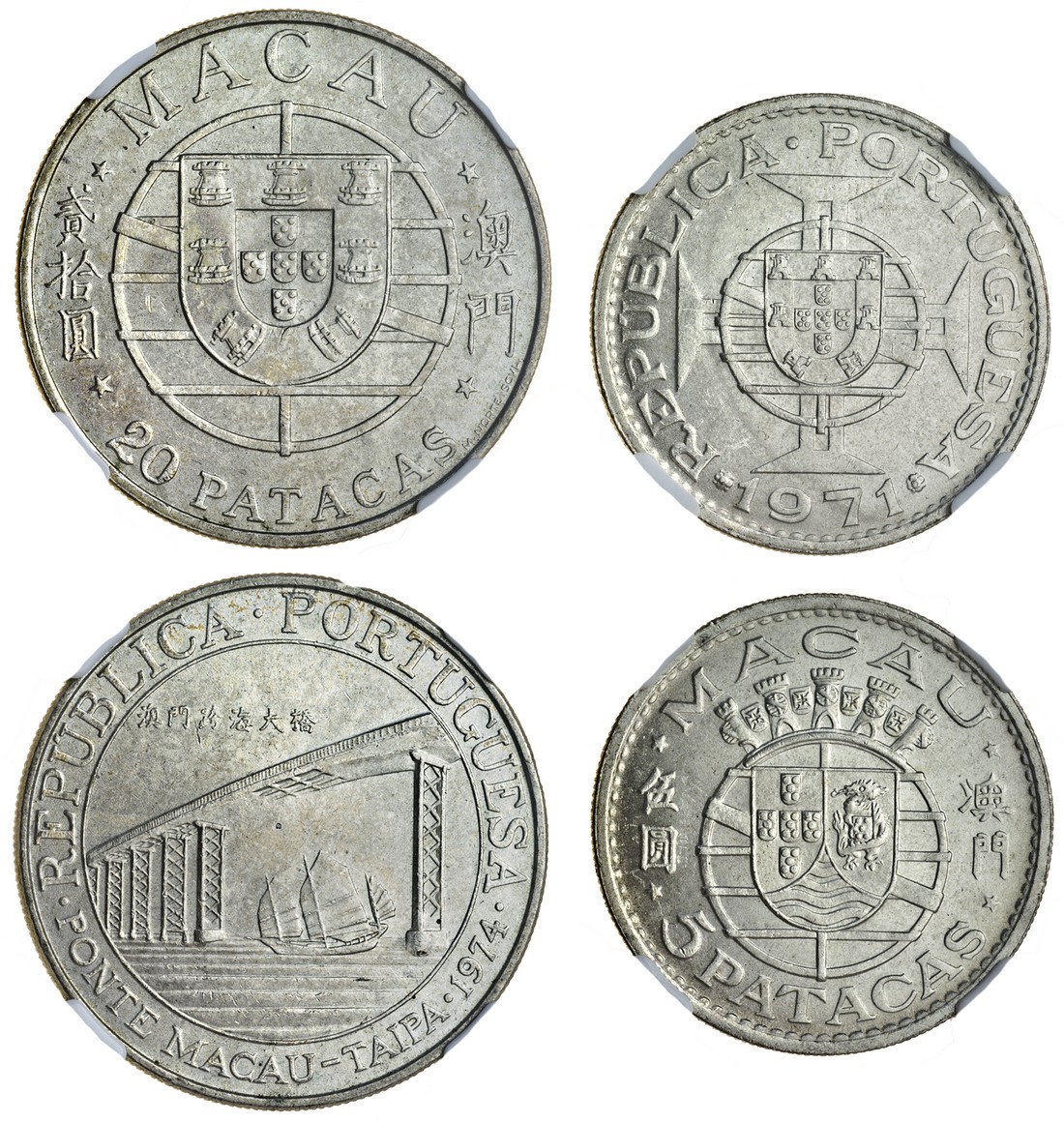Macao, 20 Patacas, 1974, Taipa Bridge (KM#8), NGC MS63, 5 Patacas, 1971 (KM#5a), NGC MS65 (2)