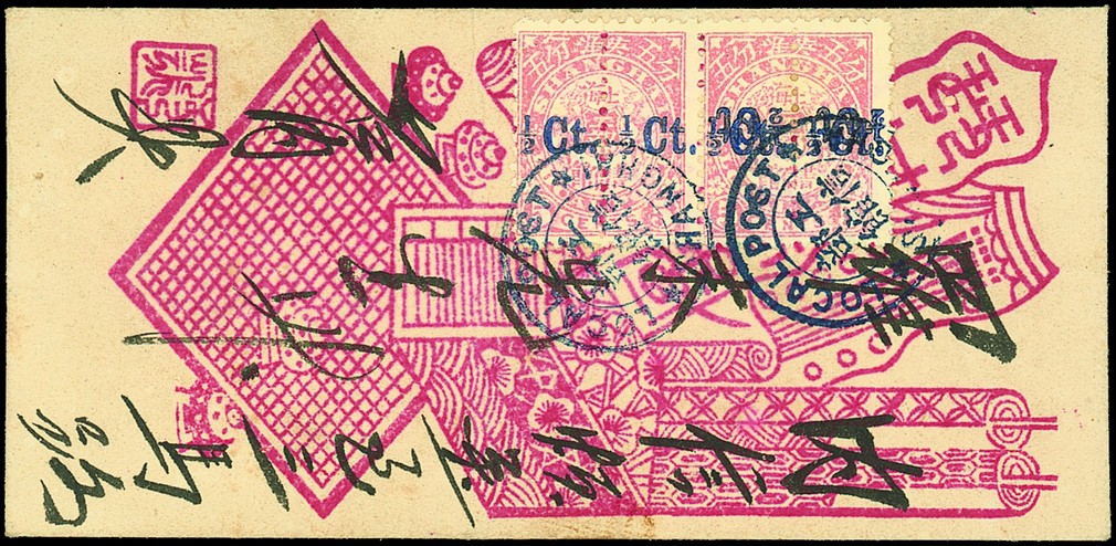 1893 (26 May) an illustrated envelope used locally, bearing 1893 ½c. on half 5c. rose (level stops) in a horizontal strip of four, the right hand pair with variety surcharge double, one inverted, the inverted surcharge with raised stops (type IA-IIIA) tied by the Local Post bilingual cancellation in blue with the Local Post c.d.s. on the reverse; folding crease clear of the adhesives, otherwise very fresh and fine. The type IIIA on variety double one inverted is extremely scarce. Photo