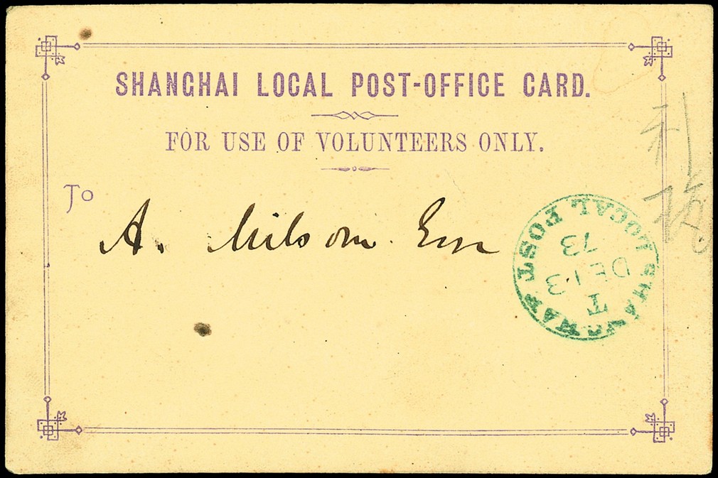 Official Cards: 1873 (13 Dec.) violet (No.1 Company) Volunteer card used locally with a good strike of the Local Post c.d.s. with index letter "T"; good to fine. This is possible the earliest known use of this card. A rare and important item of Shanghai postal stationery. Livingston OC1. Photo