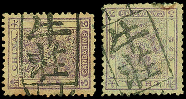3ca. mauve, two singles with central strikes of Newchwang seal cancellations in black; some faults but of good appearance. Photo
