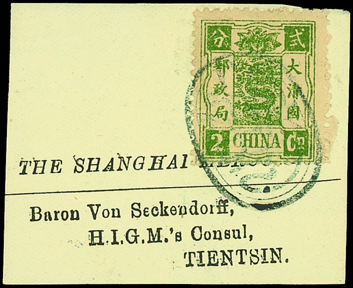 2ca. green well tied by a good strike of Shanghai seal type B on piece of newspaper wrapper from The Shanghai Mercury, addressed to Tientsin. Fresh and fine and paying the 2ca. printed paper rate. Photo
