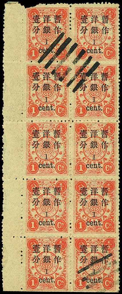 1c. on 1ca. reddish orange, a left margin block of ten, setting C left pane [1/18] bearing a pa-kua cancellation of Chungking (or Chefoo), with gum; top left stamp with defect. A good multiple. Photo