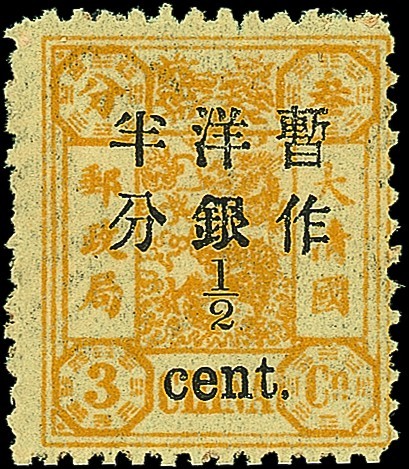 ½c. on 3ca. bright orange-yellow, variety "½" ½mm below Chinese characters, pane 4 [8], large part original gum; tiny split in one perf. at top, otherwise fresh and fine. S.G. 85a; Chan 82c. Photo