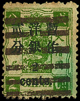 Pakhoi: Small Figures 2c. on 2ca. cancelled by a central strike of Pakhoi 122111 pa-kua in brownish black; light diagonal crease and greenish stain in lower corner. Photo