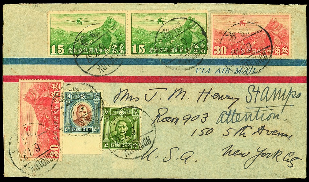 1937 (6 July) airmail envelope to New York bearing $3.10 franking tied by Honglok c.d.s., "par avion" etiquette on the reverse tied by Canton transit c.d.s. The $2 Sun Yat Sen stamp (with lower margin) shows the variety scar on face [398] (C.S.S. 393a); some edge creasing. Photo