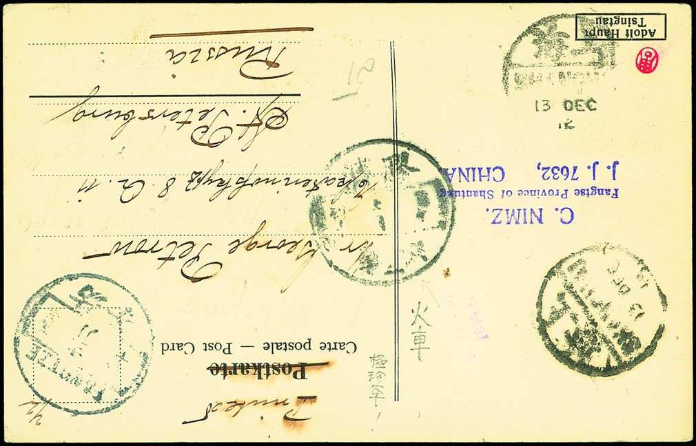Kiaochow - Tsinan Railway: 1912 (Dec.) picture postcard to Russia bearing, on the picture side, Republic 2c. tied by the despatch c.d.s., the address side with Fangtze c.d.s., two strikes of Shanghai bilingual c.d.s. (13.12) and, in the centre, a good strike of the rare Train Post Office c.d.s. Only two examples of this postmark are known (the other on C.I.P. 1c. stationery card). Photo