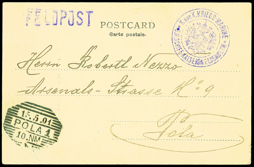 S.M.S. Kaiserin Elisabeth: 1901 (Apr.) picture postcard to Pola bearing a very fine strike of "k und k. kriegs-marine/s.m. schiff kaiserin elisabeth" double-ring cachet with double eagle emblem in centre (type 1), in purple with straight-line "feldpost" at left and Pola 1901 (15 May) arrival datestamp at left; minor corner crease, exceptionally fresh and fine. Photo