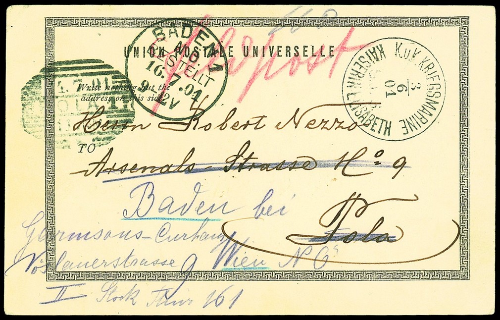 — 1901 (3 June) picture postcard of Hankow bund, addressed to Pola and bearing a very fine strike of "k.u.k. kriegsmarine/kaiserin elisabeth" c.d.s. in black, redirected to Baden with Pola and arrival c.d.s. (16.7) at left, manuscript "feldpost" in red crayon; very fresh and fine. Photo