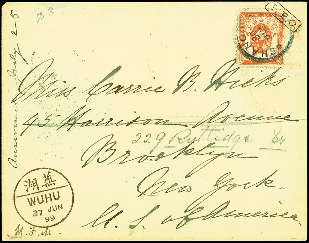 Wuhu: 1899 (27 June) envelope to New York bearing, on the reverse, C.I.P. 5c. pair cancelled by a neat and single strike of the pa-kua, Yokohama datestamp (date inverted), Vancouver and arrival c.d.s. of Brooklyn; the front with a superb strike of the Wuhu bilingual c.d.s. (a very early date) with Japan 10s. Koban with a superb strike of the Wuhu tieprint and cancelled "shanghai/i.j.p.o." c.d.s.; readdressed on arrival. A stunning and delightful example of this rare tieprint (Webb RRR). Photo