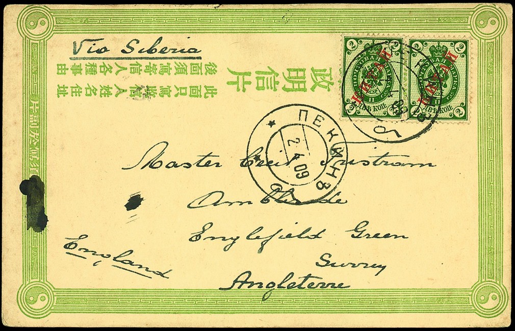 Peking: 1909 (2 Apr.) two China third issue postal stationery 1c. green cards to England bearing Kitai 2k. (2, one card missing one) tied by Peking type 7B c.d.s. with a second strike alongside. Fine and unusual use of these stationery cards. Illustrations of ornate birds on the reverse. (2). Photo