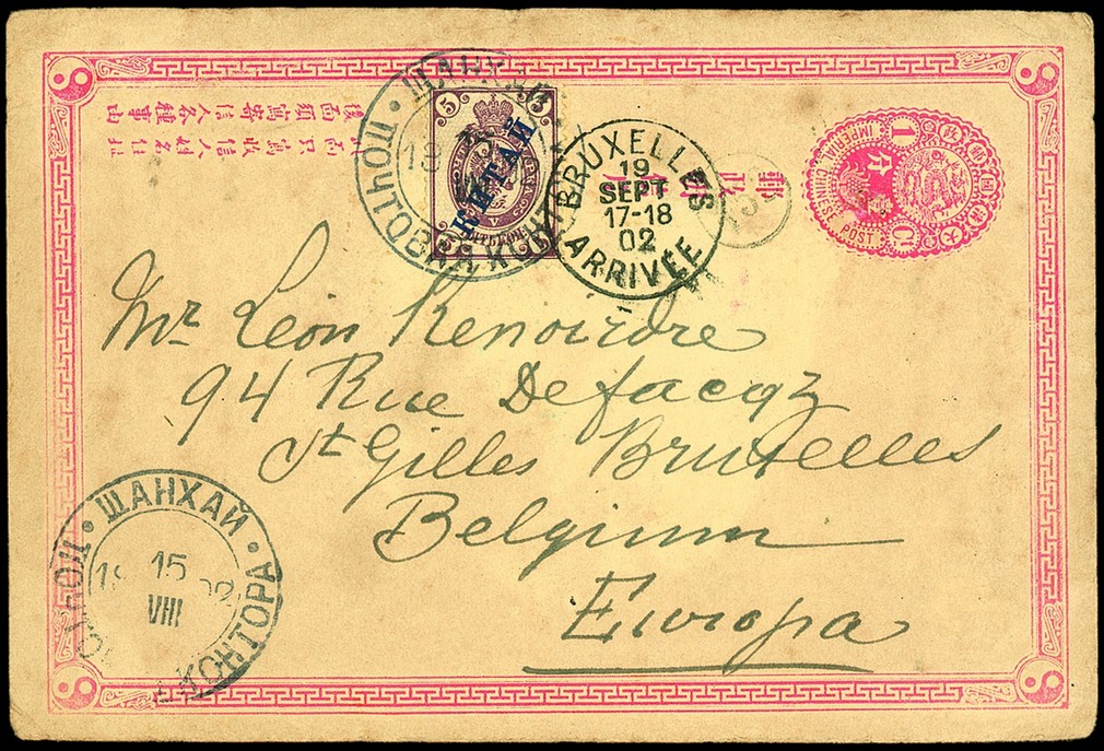 Shanghai: 1902 (15 Aug.) China first issue 1c. postal stationery card to Belgium bearing 5k. kitai tied by Shanghai first type c.d.s. with a second strike on lower corner, the adhesive also tied by Brussels arrival c.d.s. (19.9); hand-drawn illustration on the reverse. Some light soiling, good use of the postal stationery card. Photo