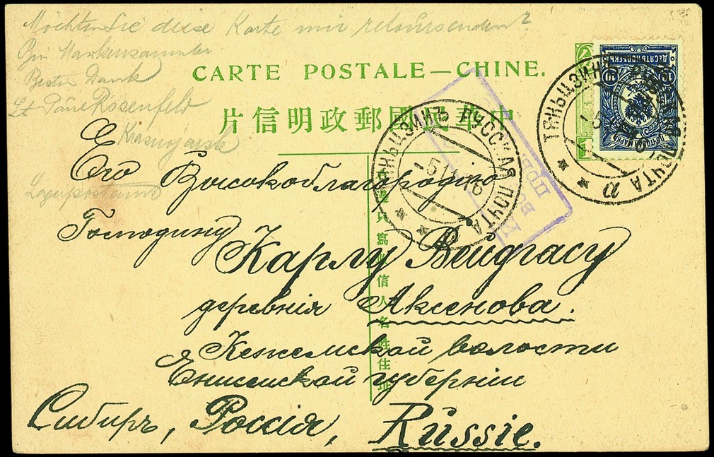 Tientsin: 1916 (5 Nov.) first Junk 1c. postal stationery card to Russia bearing Russia 10k. tied by Tientsin type 6 c.d.s. with a second strike alongside and with boxed censor handstamp; unusual use of this stationery card. Photo