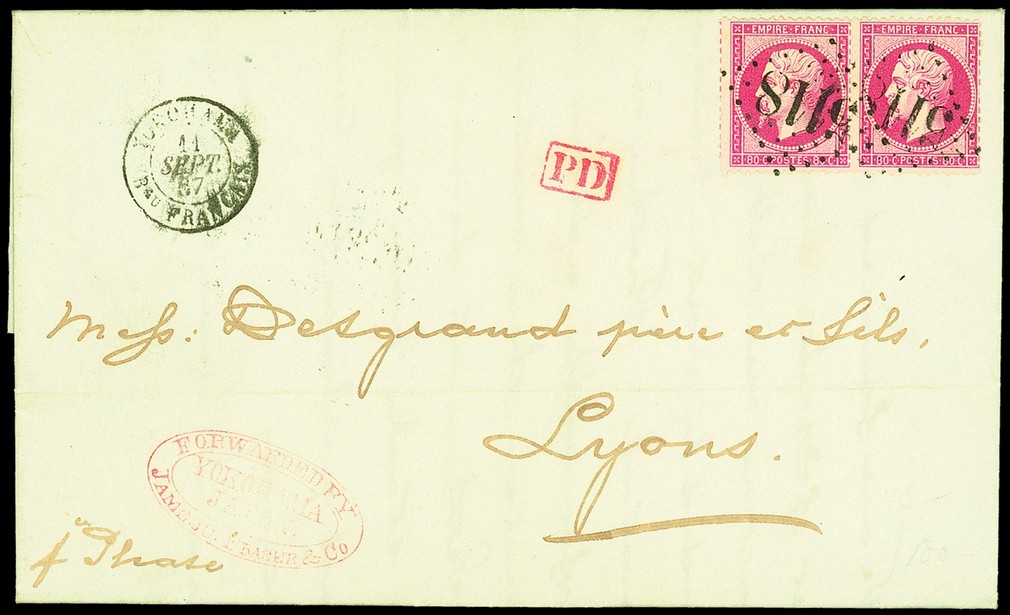 1867 (11 Sept.) entire letter to Lyon "p Phase" bearing a pair of perforated Napoleon 80c. cancelled by gross chiffres "5118" with "yokohama/bau francais" despatch c.d.s., boxed "pd" and faint "forwarded by/james c. fraser & co/yokohama" in red, used as the company handstamp, the reverse with French transit and arrival (4.11) c.d.s.; a light horizontal filing crease, a fresh and very attractive cover.