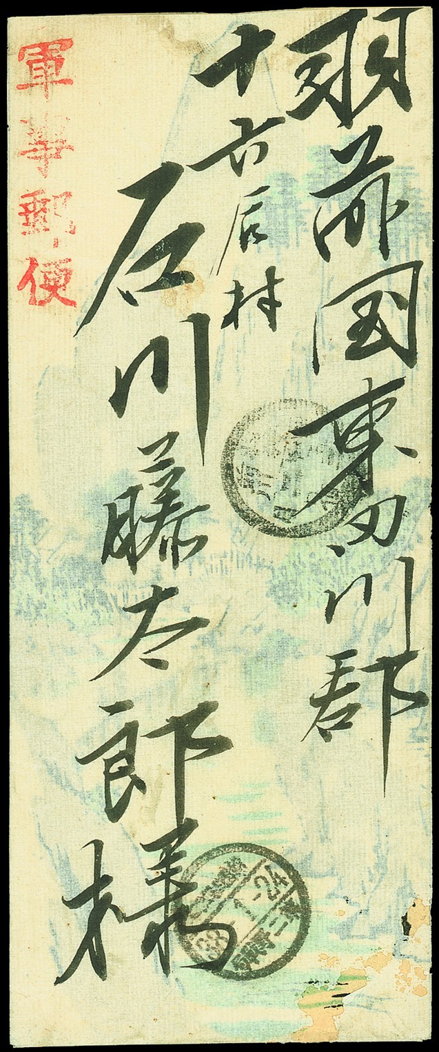 F.P.O. No.2: 1905 (24 Jan.) stampless envelope bearing a good strike of F.P.O. no.2 at Haeju and bearing handstamped "On Military Service" in red letters; some patches of surface damage; fresh. Photo
