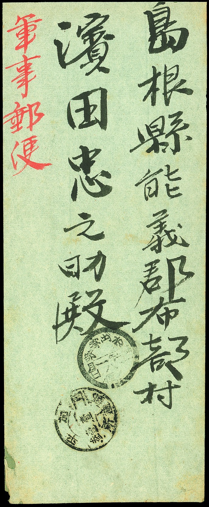 1909 (13 Jan.) stampless envelope to Shimane Prefecture bearing a good strike of the type 3 Uch'eso datestamp of Kapyeon and showing manuscript Military Mail on red ink and with arrival bisected datestamp of Izumo. A fine and important cover from a member of the military police. Photo