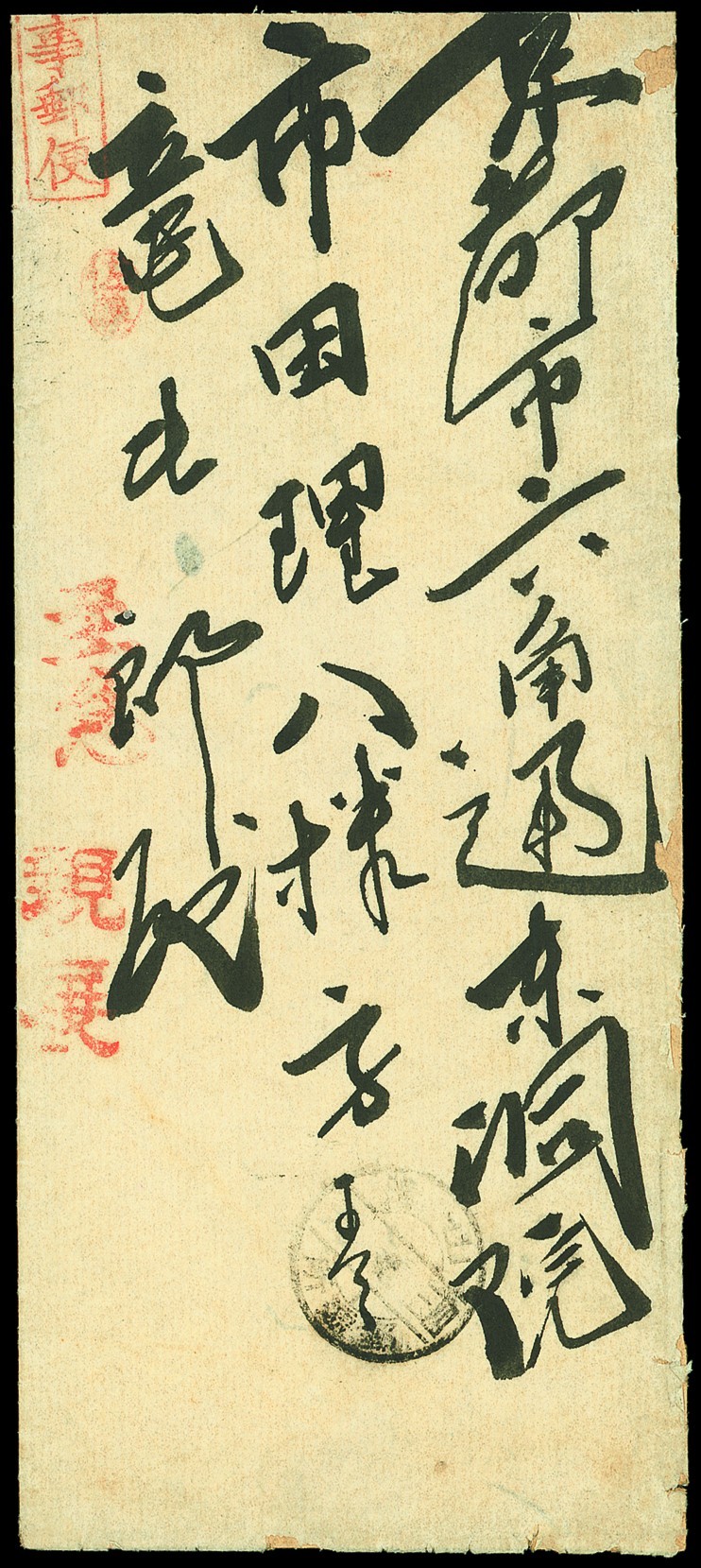 1909 (6 Feb.) stampless envelope to Kyoto bearing a fair strike of Uch'eso type 3 c.d.s. of Sancheon with red handstamps for Military Mail (part strike), Urgent and Personal and with faint arrival backstamp; trivial edge faults, a fine and attractive cover. Photo