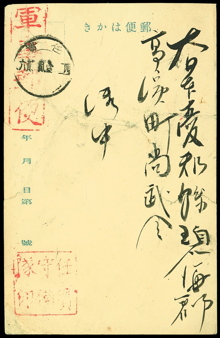 1909 (26 Dec.) military stampless post card to Hekikai bearing a fair strike of Uch'eso type 3 datestamp of Imsil along with fair strikes of boxed Military Mail and a light strike of boxed Imsil Garrison; some light creasing. A good card. Photo
