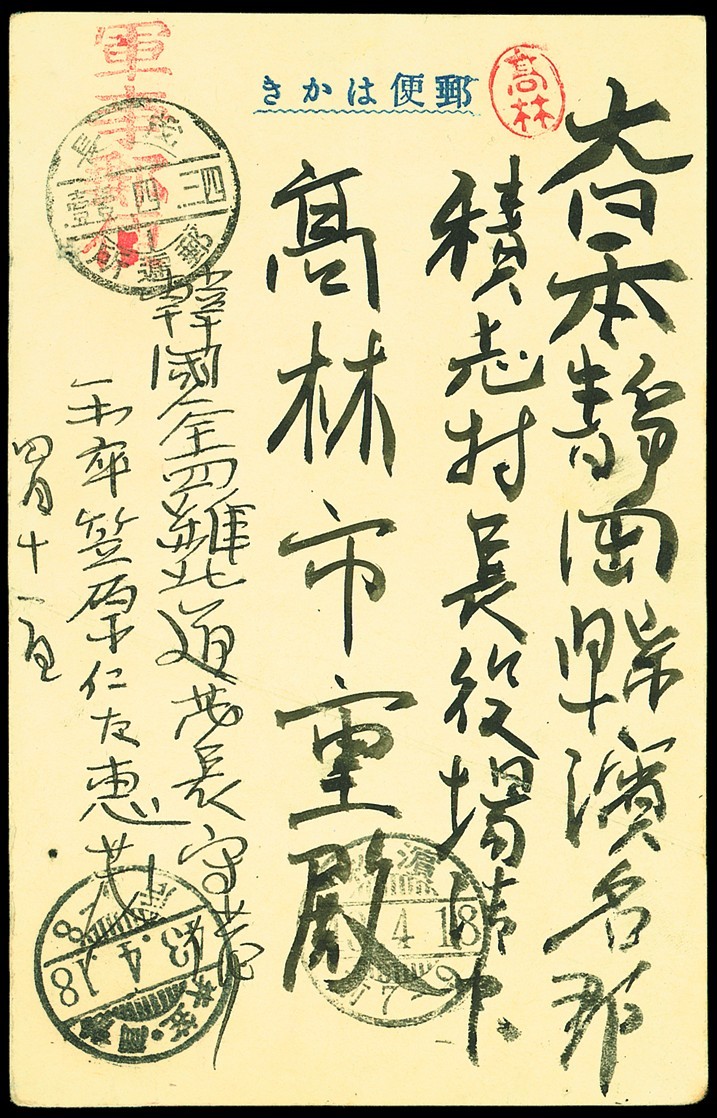 1910 (11 Apr.) military postcard to Hamana bearing a very fine strike of Uch'eso type 3 datestamp of Muchang with Military Mail handstamp in red with Hamana and Shizuoka (18.4) comb-type arrival c.d.s. at foot; diagonal crease and pin hole. Fresh and attractive. Photo