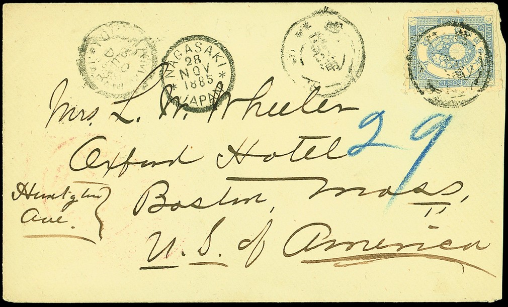 1885 (15 Nov.) envelope to Boston bearing Koban 5s. light blue (torn) tied by a fair strike of type DK Fusan-po c.d.s. with Koog at top, a second strike alongside with Nagasaki (28.11) and Yokohama (5.12) transit c.d.s. alongside, the reverse with San Francisco (19.12) and arrival (26.12) c.d.s. Fresh and attractive. Photo