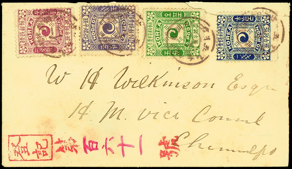 1896 (22 May) local Chemulpo registered envelope bearing 5p. to 50p. set of four tied by type IIB datestamp with the local boxed registration handstamp in red and brush strokes at foot; the cover with a vertical filing crease in centre (clear of the adhesives) and some paper adherences on reverse. 50p. is first printing. A scarce cover bearing all of the values. Note that there is also an unused set stuck inside the envelope. Photo