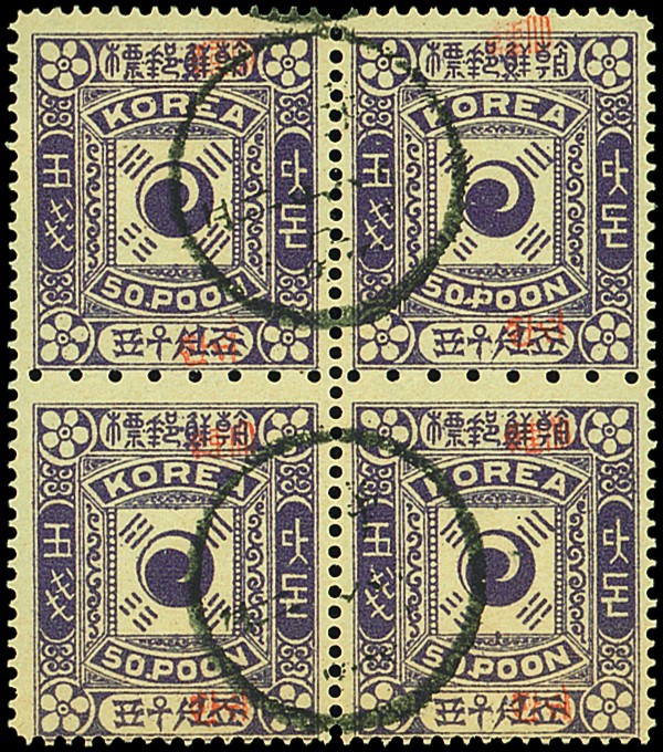 Metal Handstamp: a selection of handstamps in red showing different datestamps and includes the rare variety 50p. vertical pair perf.7½ between in a block of four, cancelled by Hansung datestamp. A good lot. (16). Photo
