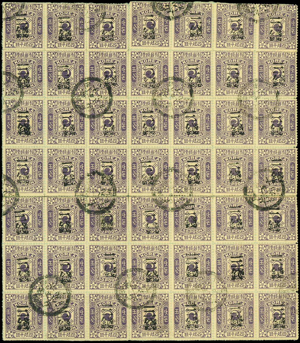 Type 1A: 3ch. on 50p. forty-nine examples on piece with blocks of 12 (2), 9 (2) strips of 4 and 3, cancelled by Pusan 1905 (19 Aug.) bisected circle datestamp; good to fine. A very rare piece and an outstanding item of the highest calibre - multiples of any size are rare, this block being quite remarkable. S.G.49, £31,850 as singles. Photo