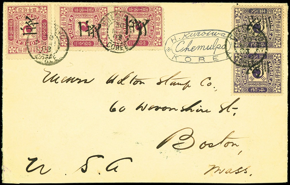 Type IV: 1903 (30 May) opened out, commercial envelope to Boston bearing type IV 1ch. on 25p. (3) and 3ch. on 50p. horizontal pair and, on the reverse, Plum Blossom 2re. strip of five, cancelled by Chemulpo type 4 c.d.s. along with Seattle machine cancellation. Fine and scarce. Photo