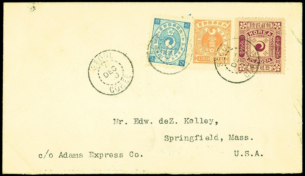 1900 (1 Dec.) envelope to U.S.A. bearing 2ch. and 3ch. with 1895 "Tae Geuk" first printing 25p. tied by Seoul type 4 c.d.s.; some wrinkling at sides, the reverse with Chemulpo, San Francisco and arrival c.d.s. Fine and a good combination with the first printing. Photo