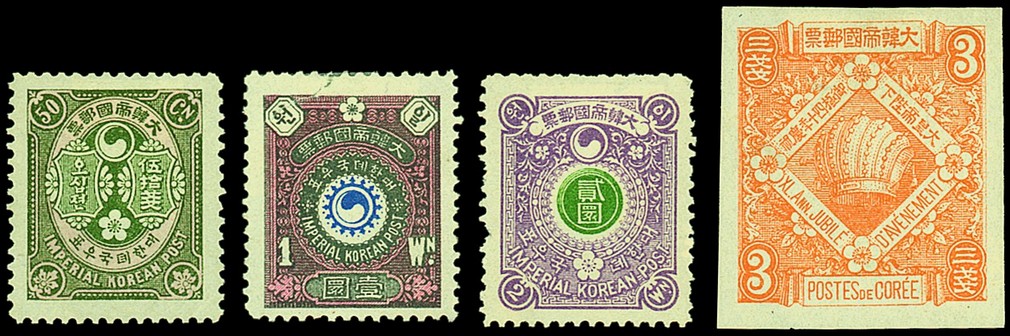 A small group with 1903 Plum Blossom 50ch., 1wn. and 2wn. (pulled perf.), Emperor's Accession 3ch. imperforate, from presentation booklets (tiny blue ink mark at foot) plus 1905 picture post card to Germany bearing Falcon 5ch. tied by "seoul/i.j.p.o." c.d.s.