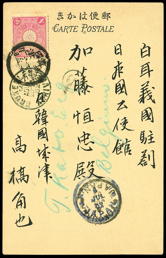 Seongjin: 1902 (25 June) picture post card of the sea routes around Japan and Korea, to Belgium bearing 4s. rosine tied by a fine strike of Seongjin bisected circle with Nagasaki c.d.s. overstruck by Yokohama c.d.s. and Brussels arrival; light vertical crease, otherwise fresh and fine. Photo