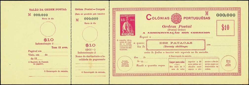 1913 25a. to $10 set of six with values in patacas and shillings, each with two counterfoil slips (perforated) and numbered "000:000"; fine. A slightly different fount to the previous set with values. Believed to be a unique set. Photo