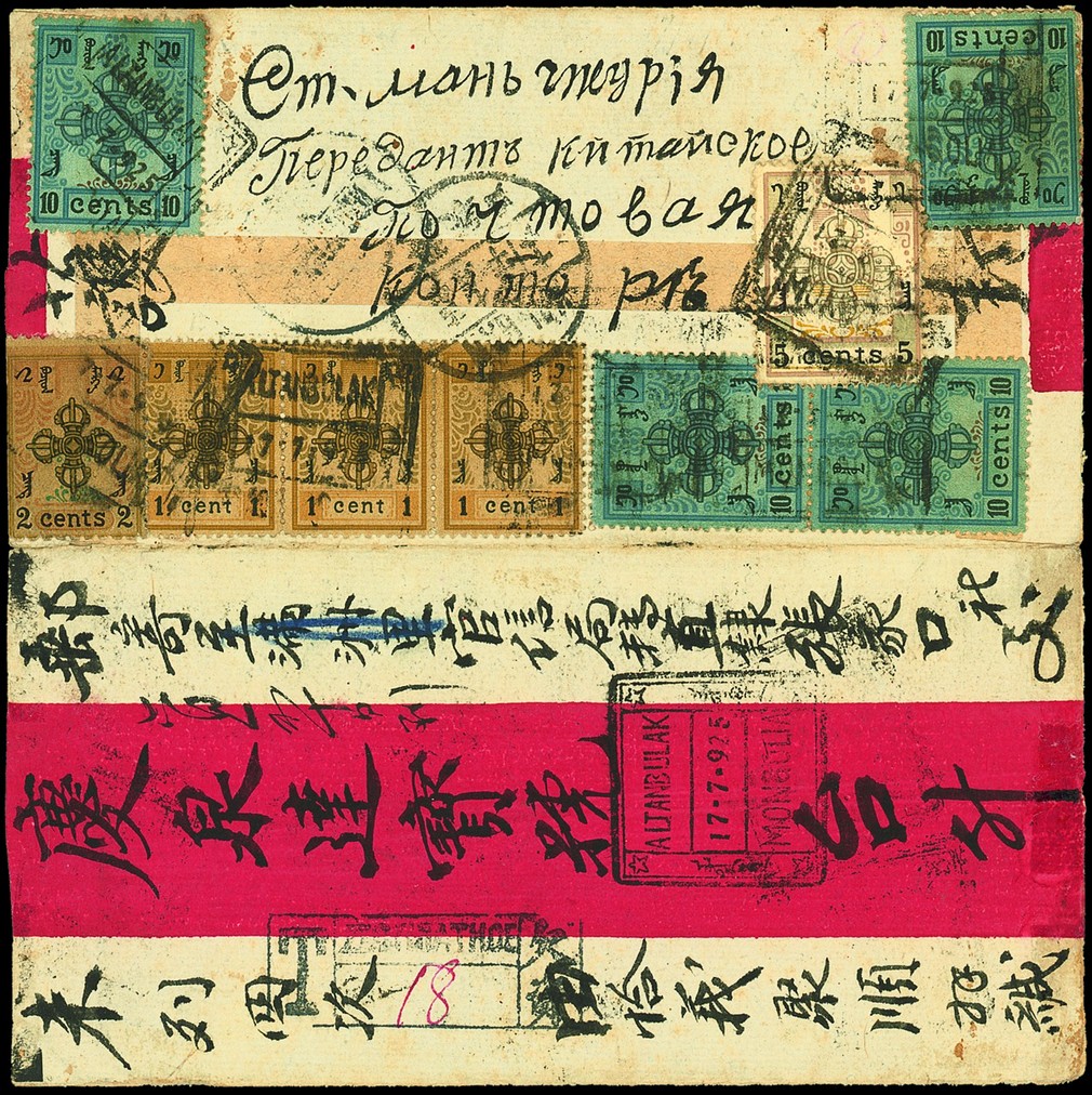 1925 (17 July) opened-out red band cover registered to Kalgan bearing, on the reverse, first definitive 1c. (3), 2c., 5c. and 10c. (4) tied by fair strikes of boxed Altan Bulak datestamp and Kalgan arrival c.d.s. (30.7), the face with fine strikes of the boxed datestamp and registration handstamp. A fine cover. B.P.A. Certificate (2011). Photo