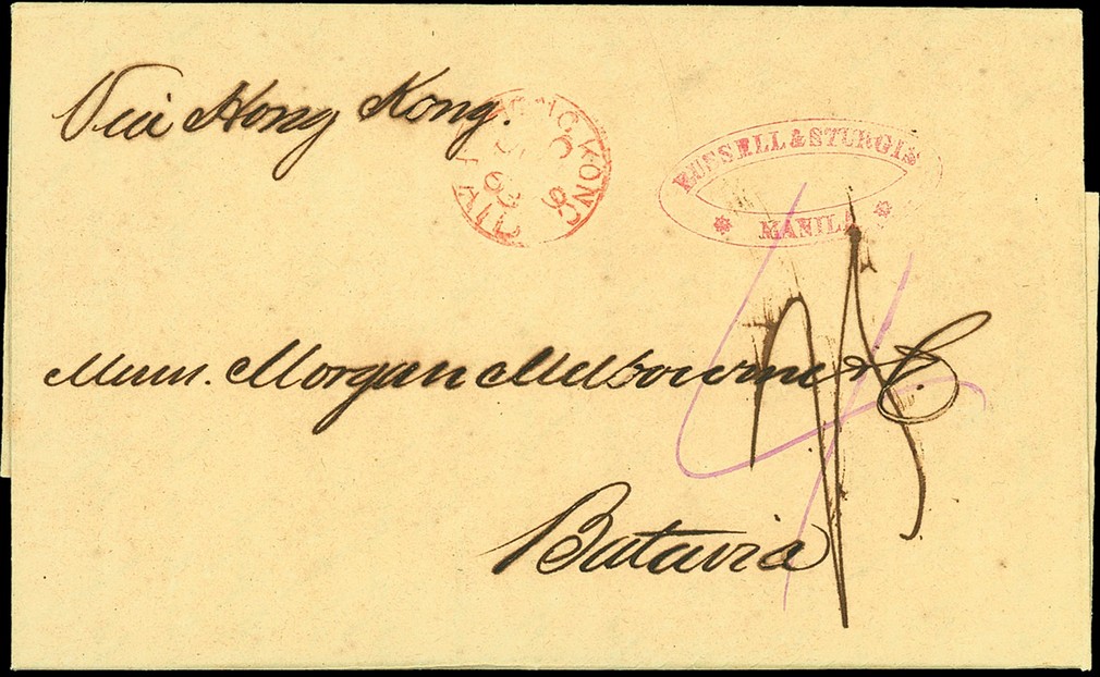 1863 (3 July) stampless entire to Batavia "Via Hong Kong" with two rate marks including "4" in red ink, Russell & Sturgis company oval and Hong Kong Paid c.d.s. (9.7) in red, Hong Kong transit on the reverse; some light ageing but still good appearance. Photo