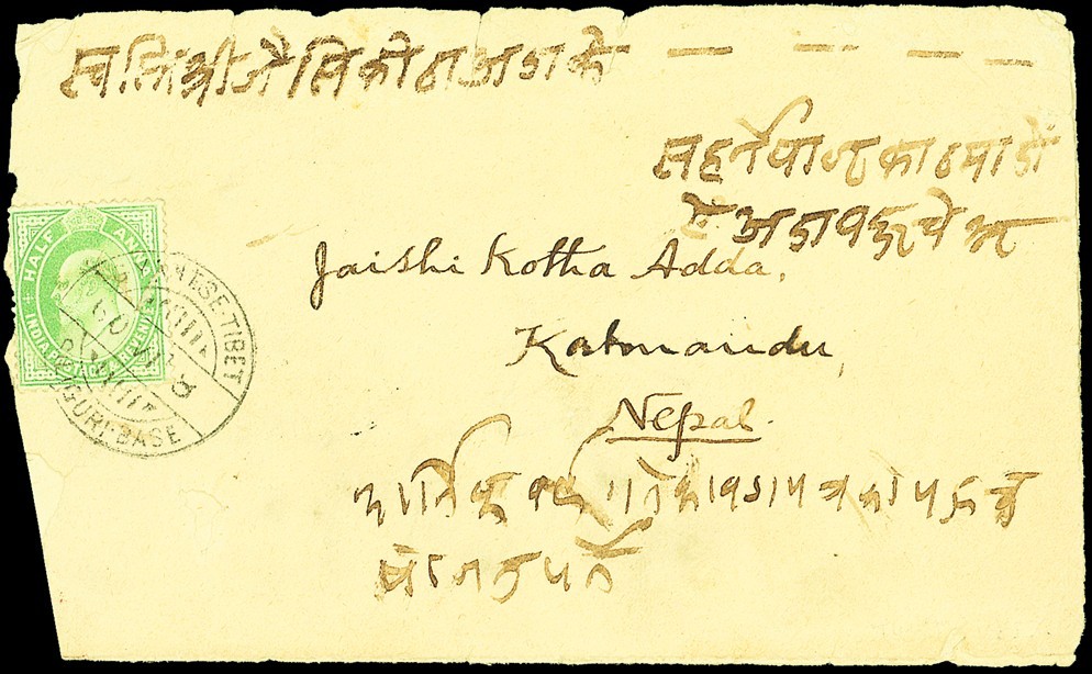 1909 (8 Jan.) envelope to Katmandu bearing India K.E.VII ½a. tied by a fine strike of "gyantse tibet/siliguri base" c.d.s., the reverse with Base Office (15.1) and Nepal (18.1) c.d.s.; some light peripheral soiling, good appearance. Photo