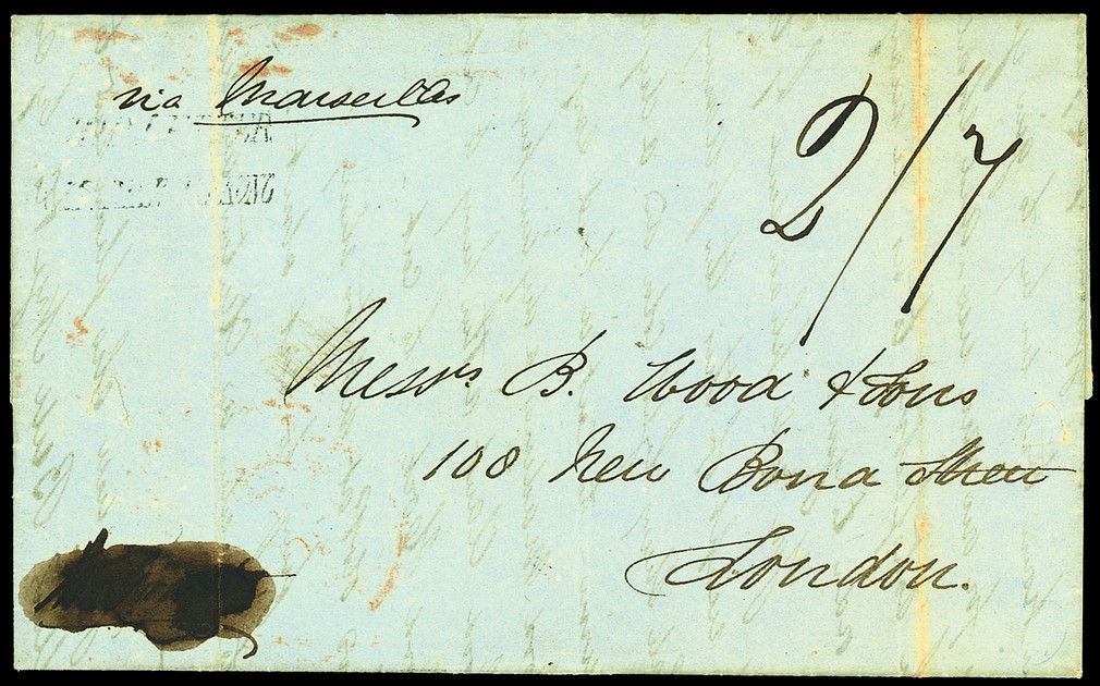 1849 (29 Oct.) entire letter from Huth & Co in Canton to London "via Marseilles", rated "2/7" and bearing a faint strike of "ship letter/victoria-hongkong", the flap bearing a light strike of the type 9 Hong Kong c.d.s.; vertical folding creases, good appearance. The anticipated packet ship being obliterated as this was initially carried on the P&O 'Pekin'. An unusual route and rate. Photo