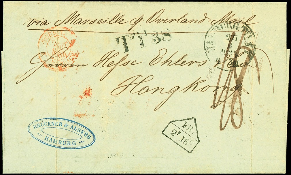 1857-70: FR./2f16c: 1864 (25 Aug.) stampless wrapper from Hamburg to Hong Kong "via Marseilles pr Overland Mail", rated "1/8" and with fine strikes of "TT38" and the type L accountancy mark, with the despatch c.d.s., "tour-t/erquelines" c.d.s. in red and the company handstamp, the reverse with Marseilles to Lyon and Hong Kong arrival c.d.s.; two vertical folding creases at sides. Fresh and rare. Webb RRR. Photo