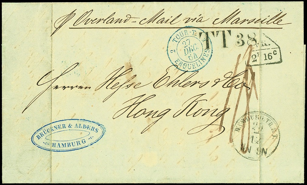 — FR./2f16c: 1864 (25 Dec.) stampless envelope from Hamburg to Hong Kong "p Overland Mail via Marseilles", bearing good to fine strikes of handstruck "TT38" and the type L accountancy handstamp, rated "1/8" with Hamburg despatch c.d.s., a very fine strike of "tout-t/erquelines" c.d.s. in blue and the company oval, the reverse with Marseilles and Hong Kong arrival c.d.s.; two vertical folding creases at sides, one through the accountancy mark. Webb RRR. Photo