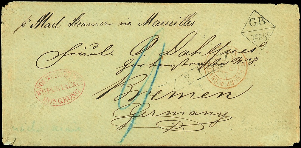 — GB/1f66c:1868 (16 Sept.) envelope from Pustau & Co, Hong Kong (handstamp at left) to Germany "pr Mail Steamer via Marseilles" bearing a good strike of the type N accountancy mark, rated "9" in blue crayon and with a faint strike the Franco-Prussian "F/41" accountancy mark; the reverse with Hong Kong despatch, French transit and Ausg (1.11); some light ageing but a rare and important double accountancy mark cover. Photo