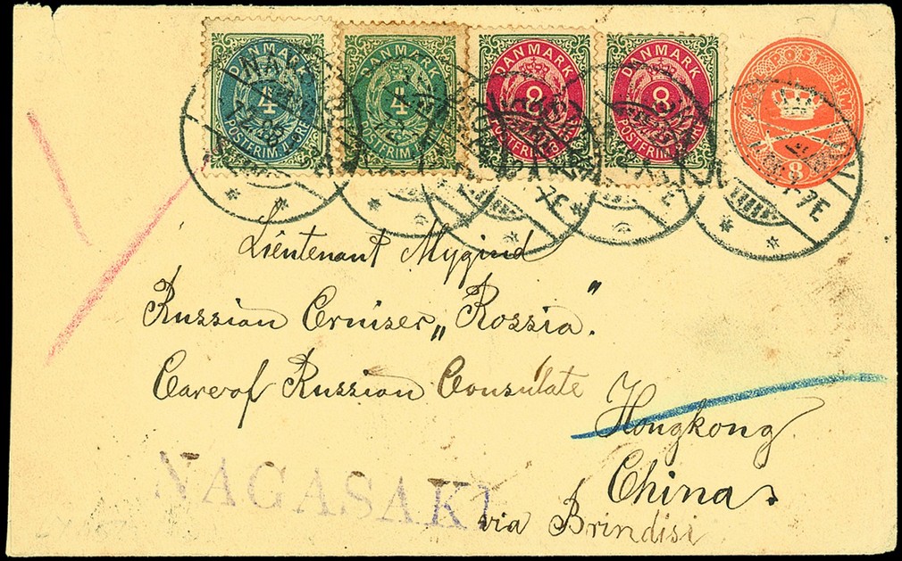 1898 (7 Feb.) Denmark 8ö. stationery envelope uprated with 4ö. (2) and 8ö. (2) cancelled by Narskov c.d.s., addressed to the Russian Consulate in Hong Kong "via Brindisi" then redirected to Nagasaki, the reverse with two Hong Kong (14.3) and Nagasaki (28.3) c.d.s. A fine, unusual and colourful cover. Photo