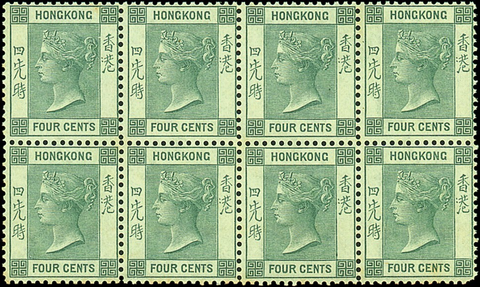 4c. grey in a block of eight, unmounted mint; rounded corner lower right and a few minor bends or wrinkles, well centred. Fresh and desirable. S.G. 9. Photo