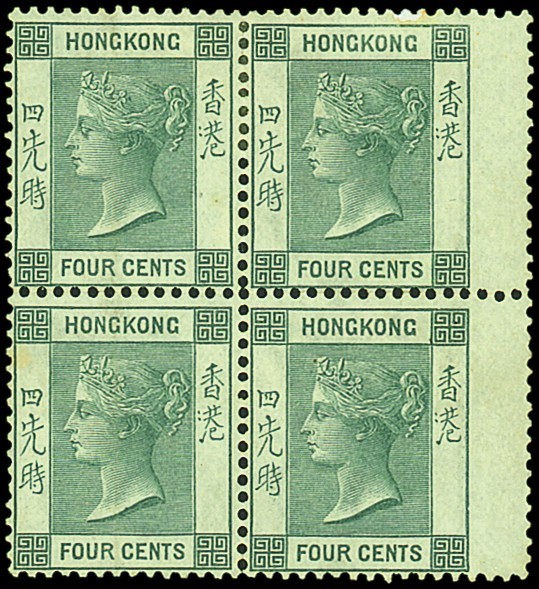 4c. slate in a wing margin block of four, large part original gum with hinge remainder on top pair; light vertical crease at left. Well centred and fresh appearance. S.G. 9b. Photo