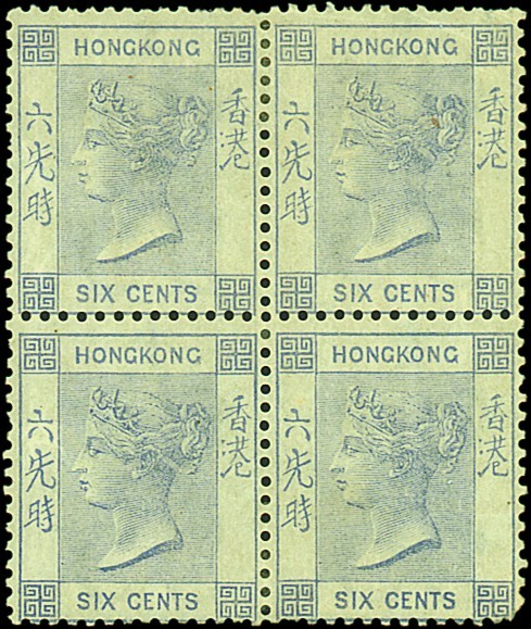 6c. lilac in a block of four, part to large part original gum showing typical gum streaking; blunt corner perf. and small corner crease. S.G. 10. Photo