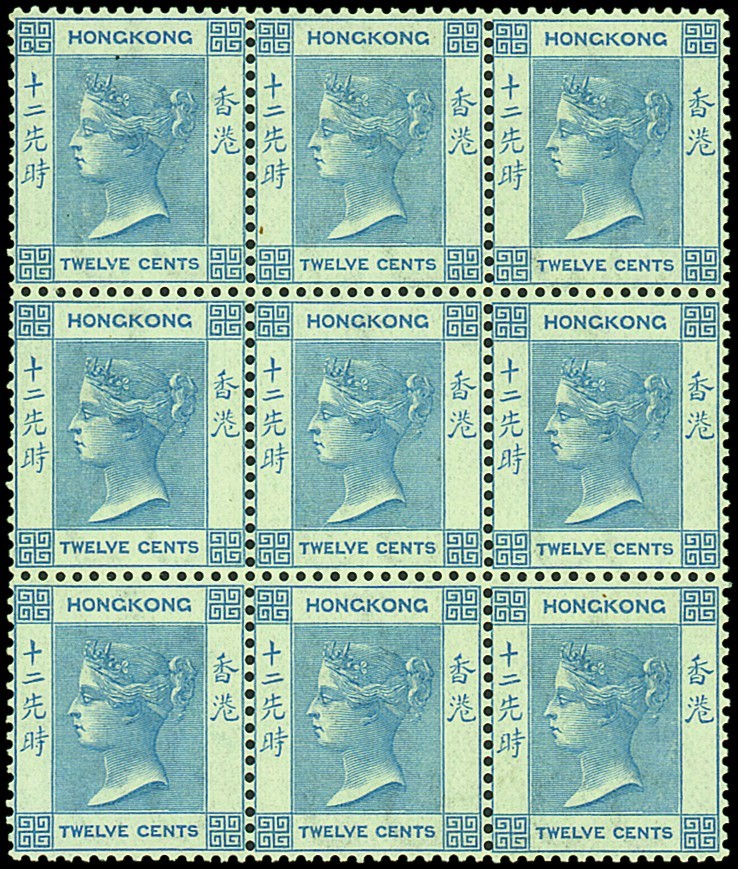 12c. pale blue in a block of nine, lightly mounted on one stamp only; light horizontal bend through the central row. Well centred and a very fresh block. Photo