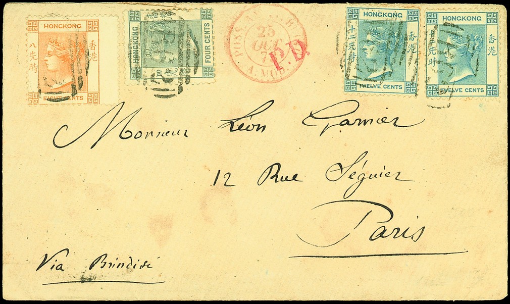 1873 (10 Sept.) envelope to Paris "Via Brindisi" bearing 4c., 8c. (with wing margin) and 12c. (2) tied by light strikes of the "B62" with French Brindisi transit and "P.D." in red between the adhesives, despatch and arrival (26.10) c.d.s. on the reverse. Paying double the 18c. rate. Minor soiling does not detract from this delightful, three-colour franking. Photo