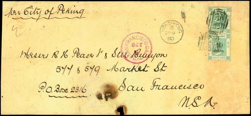 1880 (9 Sept.) envelope to San Francisco "per City of Peking" bearing a vertical pair of 10c. on 12c. pale blue tied by "B62" with the code "B" despatch c.d.s. alongside and San Francisco arrival (4.10); a couple of burn marks on the front with some creasing and soiling. A good double rate cover paying the 10c. U.P.U. rate introduced on 18th February. Photo