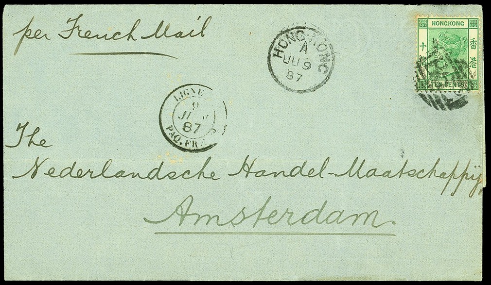 1887 (9 June) entire letter from Shanghai to Amsterdam "per French Mail" bearing 10c. green tied by "B62" with Hong Kong despatch alongside and "ligne n/paq.fr." c.d.s. alongside, the reverse with Amsterdam arrival (13.7). The contents give accounts of Dutch camlets and Dutch jeans. A surprisingly rare destination from Hong Kong, we do not have a record of any other Q.V. mail to Holland. Photo
