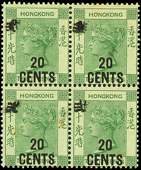20c. on 30c. grey-green in a block of four with large Chinese character, type 1, mint and mounted on the top pair only; three stamps show slight doubling of the Chinese character. A couple of tiny rust spots barely detract from this fresh and impressive multiple. Yang 45b. Photo